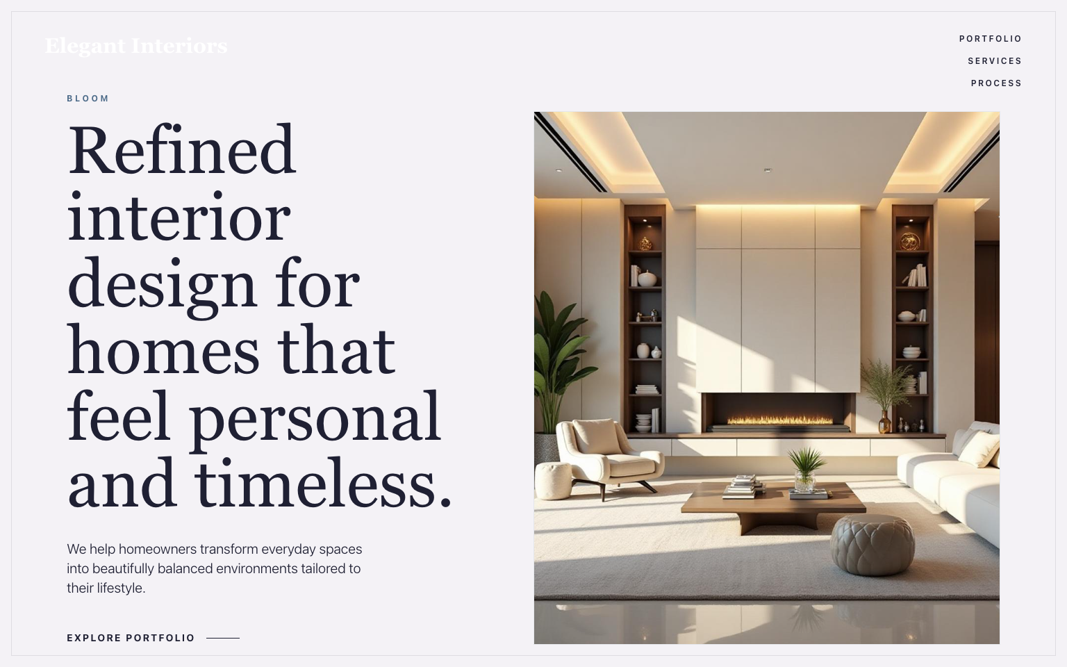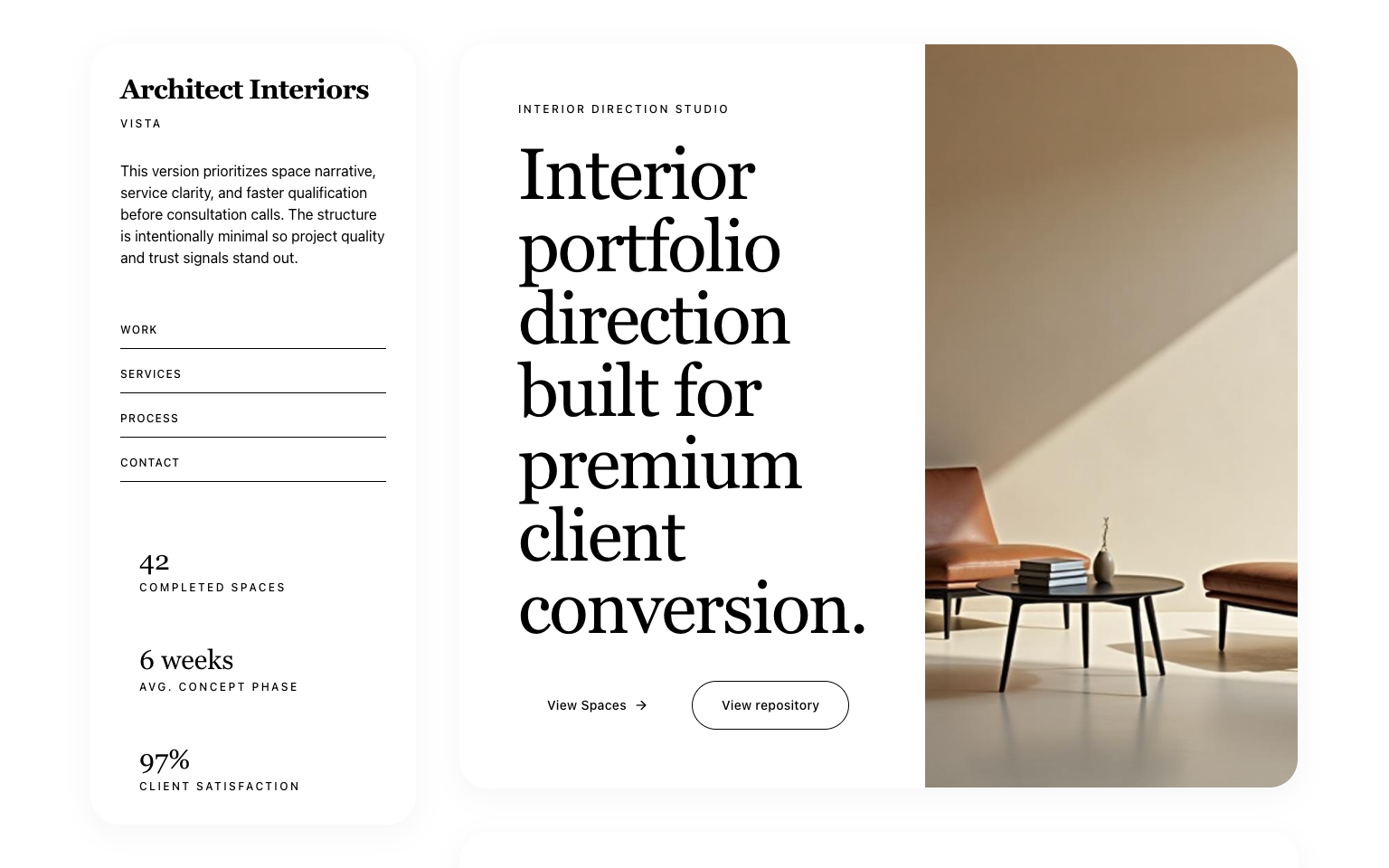 Interior portfolio iteration tuned for better hierarchy, decision clarity, and more credible service messaging.