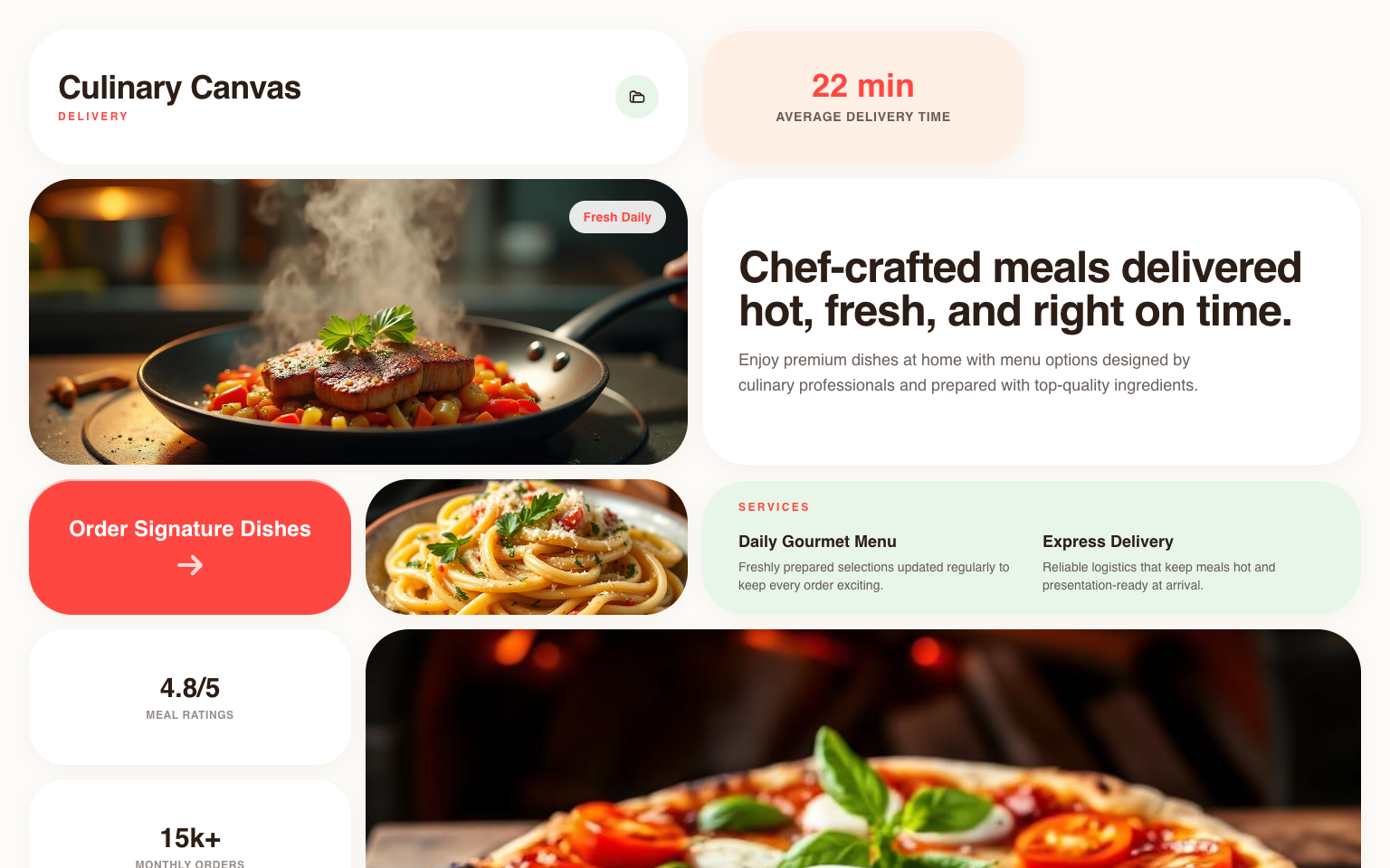 Food delivery concept improved with more realistic content, better contrast, and practical conversion flow.