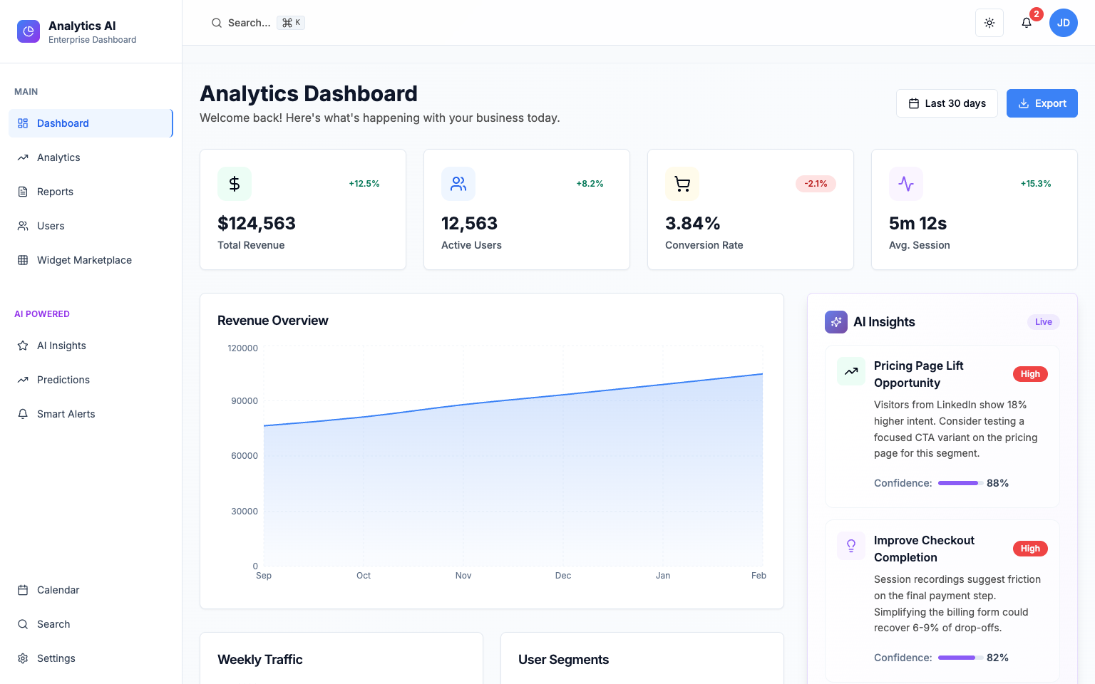 Public LiveEnterprise analytics dashboard with improved UX, persistent widgets, and local backend APIs using Next.js + Prisma.