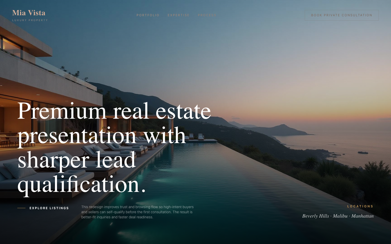 Luxury real-estate portfolio concept with cleaner lead qualification flow and stronger trust-building information design.